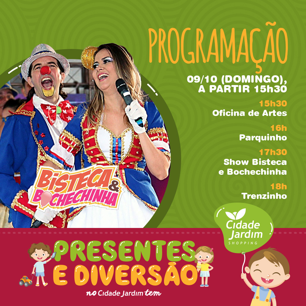 “A partir do segundo semestre deste ano, ampliamos nosso entretenimento ao público infantil. Essa diversão tem atraído um forte público aos finais de semana e geralmente quem vem em uma semana retorna na seguinte, o que para nós tem sido um importante feedback deste investimento. Agora no mês das Crianças, fomos mais ousados colocando uma programação de quase uma semana com opções educativas, inovadoras além de grandes atrações como o Circo Groock e os Palhaços Bisteca e Bochechinha”, comentou o gerente de varejo do Cidade Jardim, Ronaldo Fernandes.
