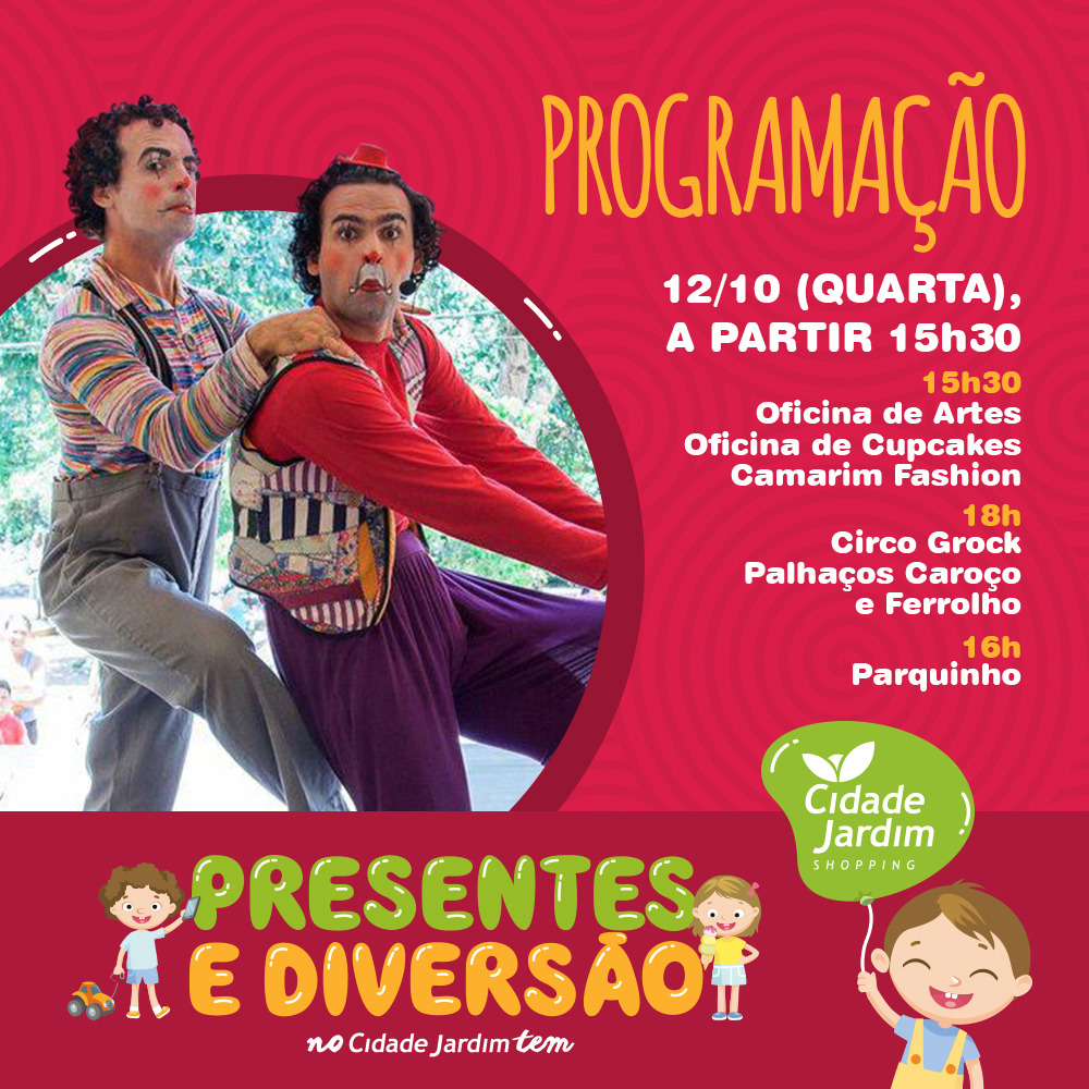 A programação infantil do Shopping Cidade Jardim termina na quarta-feira, dia 12 de Outubro, Dia das Crianças. A partir das 15h30, serão abertas as oficinas de artes, cupcakes e o camarim fashion. O parquinho, que é comum nos domingos, também ficará montado neste dia, das 16h às 21h. Para encerrar a festa, às 18h começa o show do Circo Grock e dos palhaços Caroço e Ferrolho.