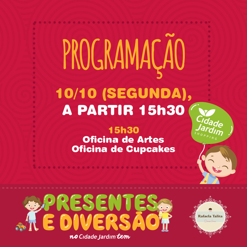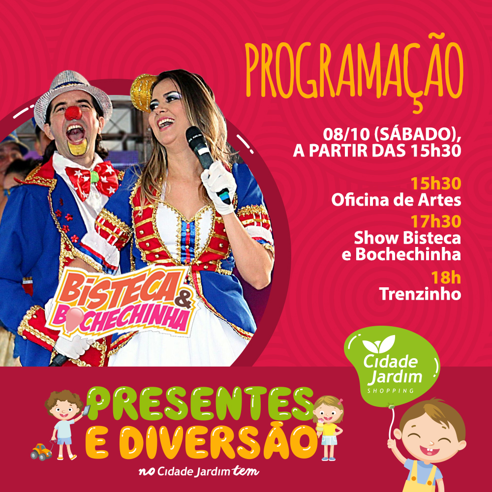 O Shopping Cidade Jardim preparou uma programação cheia de diversão em comemoração ao mês das crianças. A partir deste sábado (08) até o dia 12 de outubro tem muita diversão com show dos palhaços Bisteca e Bochechinha e Caroço e Ferrolho, Circo Grock, oficinas de artes e cupcakes - com diferentes abordagens a cada dia, trenzinho, parquinho e muito mais.